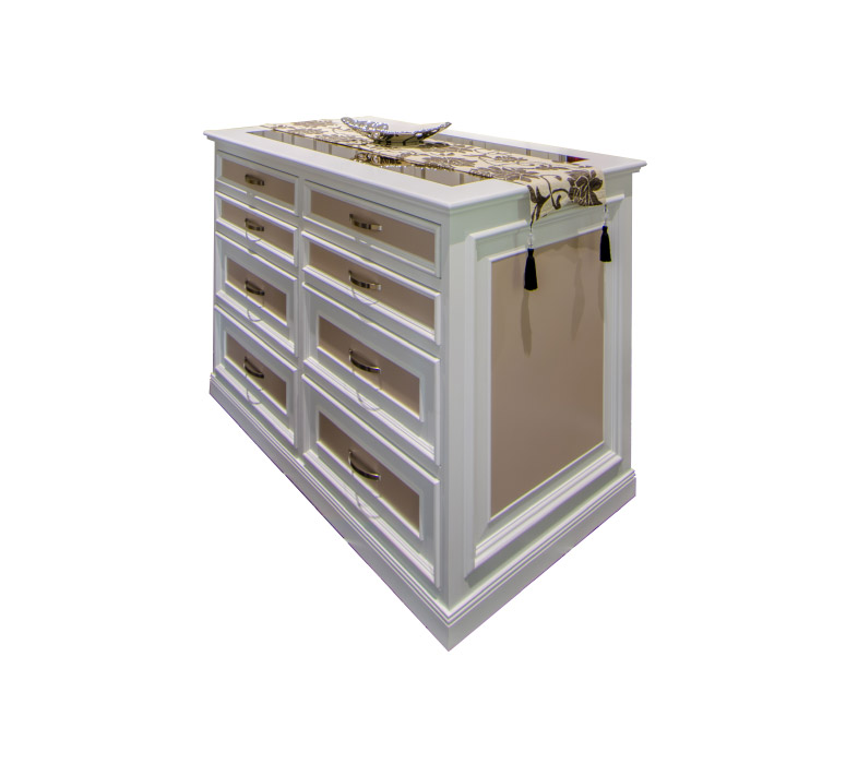 Ivory white duco combined with soft taupe finishings, finished in ivory solid surface top and tempered glass.